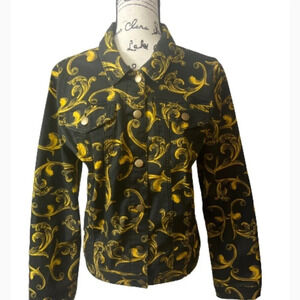 Masseys Jean style Jacket black and gold scroll print. Front button cotton and spandex material non denim. Stretch. Excellent condition measurement in pics