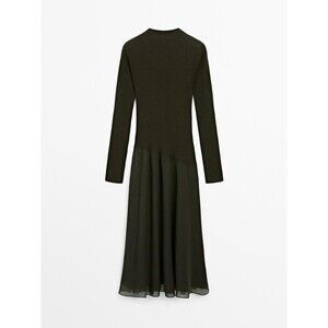 MASSIMO DUTTI Contrast Knit Dress Olive Green Size Large Mock Neck Flowy Bottom