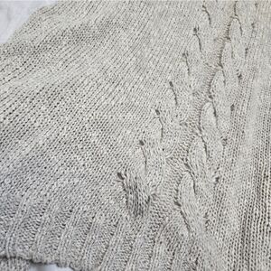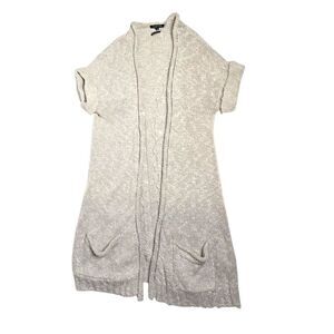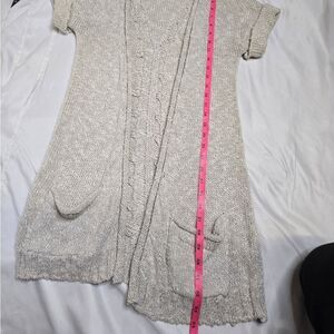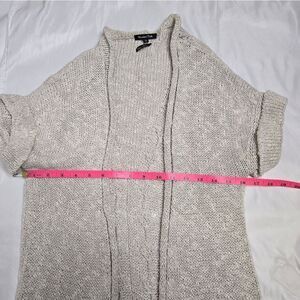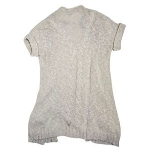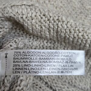 Cotton linen blend short sleeve oatmeal color longline cardigan sweater by Massimo Dutti. Cable knit with two side pockets. Faint spot on the back shown in photos. Cotton, linen.