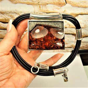 RUNWAY JEWELRY, DESIGNER JEWELRY, ARTISAN JEWELRY, LEATHER NECKLACE, AMBER SILVER JEWELRY, BOLD AMBER PENDANT, OUTSTANDING JEWELRY, BLACK LEATHER CORD, RARE TO FIND JEWELRY.