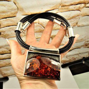 MASSIVE AMBER STERLING PENDANT MULTI LEATHER CORD NECKLACE, GIFT FOR WOMEN