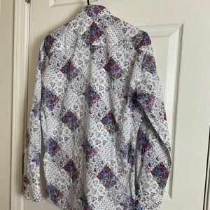 Machine wash cold or dry clean recommended Stylish men's shirt featuring a vibrant multicolor pattern on a white base. Perfect for adding a pop of color to your wardrobe.