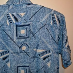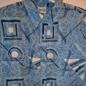 MATCH 1 Men's Hawaiian-Style Geometric Design Shirt Size XXL. Shades of Blue. Pit to Pit is 26 inches and Collar to bottom of shirt is 33 inches. 100% Polyester.