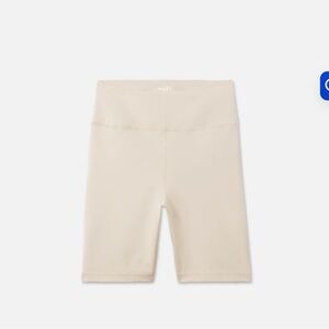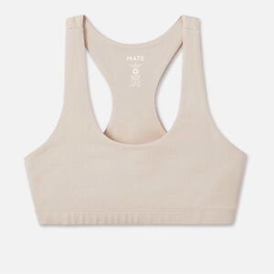 Nude beige sports bra with matching high-waist short leggings. Soft stretch fabric. Racerback bra. Simple, minimalist active set.