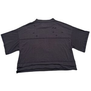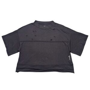 Stylish black crop top. Features distressed details. Short sleeves. Perfect for casual wear.