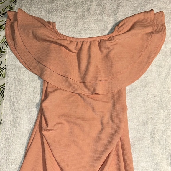 -pink, stretchy, tight fitted maternity dress im 5’2 and the dress is to my knees only worn once for baby shower!