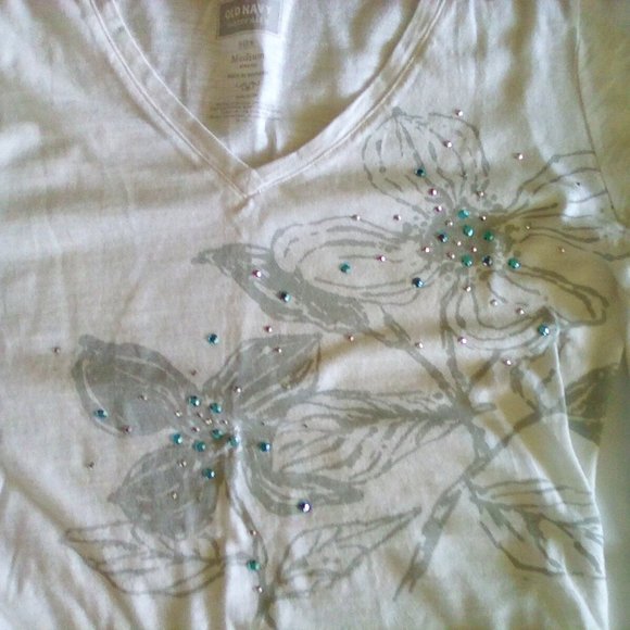 TURQUOISE & WHITE RHINESTONE BEADS ON SHIRT