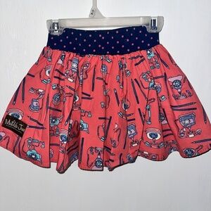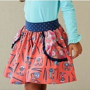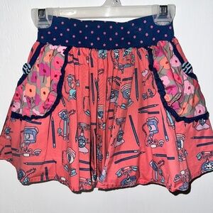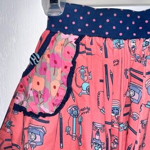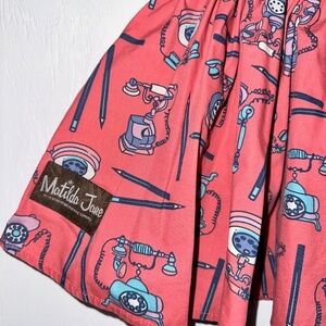 This darling skirt is covered in telephones with two flowered pockets and trimmed with cute striped buttons.