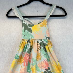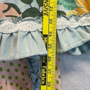 This adorable Matilda Jane girls 2-piece outfit in size 8 includes a colorful floral tunic top paired with coordinating polka dot ruffle shorts. The sleeveless top features adjustable crisscross straps, soft pastel tones, and lace trim with ruffle detailing along the hem. The matching shorts are peach with green polka dots and finished with blue ruffle trim for a playful look.
