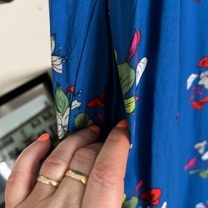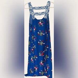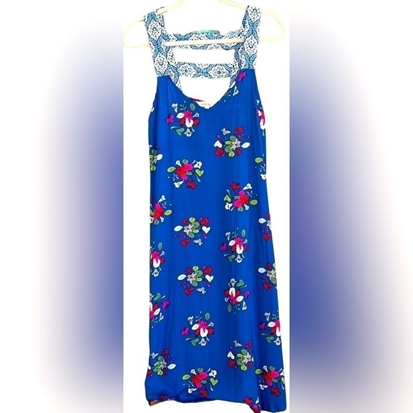 Super soft, comfy, lightweight flare sundress. Matilda Jane brand size medium. Royal blue/red/pink/green/white floral w/blue/white pattern on straps. Dress has a slight flare and two side pockets. Perfect for warmer temps. This has been worn 1-2 times, washed carefully and line dried.