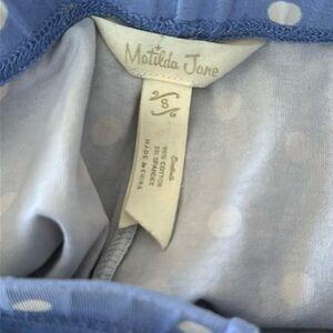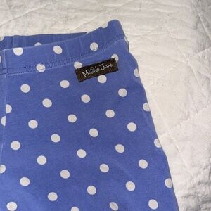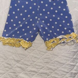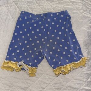 blue & white polka dot with yellow hem line polka dot ruffle, cotton/spandex material, pull on shorties, elastic waist band