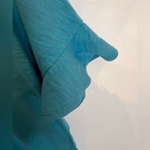 MATILDA JANE WOMEN’S TOP. SIZE XL. TURQUOISE TONES RUFFLE STYLE SHORT SLEEVES