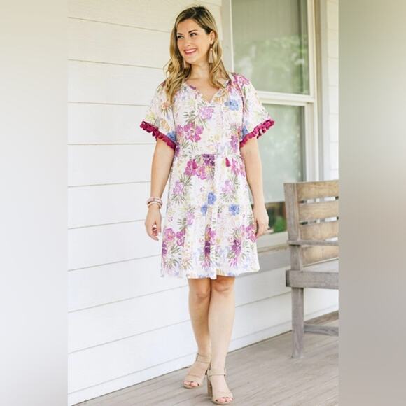 MATILDA JANE Women's Aloha Palm Printed Ruffle Sleeve Dress NWT size small