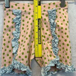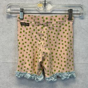 This adorable Matilda Jane girls 2-piece outfit in size 8 includes a colorful floral tunic top paired with coordinating polka dot ruffle shorts. The sleeveless top features adjustable crisscross straps, soft pastel tones, and lace trim with ruffle detailing along the hem. The matching shorts are peach with green polka dots and finished with blue ruffle trim for a playful look.