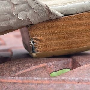 Normal wear and tear noted, there is a small chunk out of the heel of one shoe see last photo