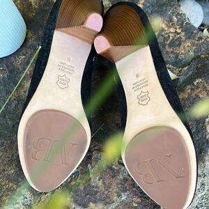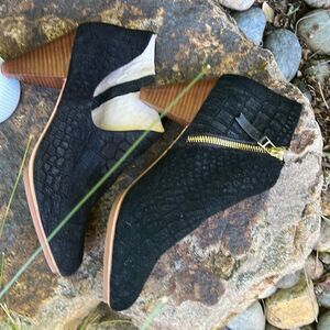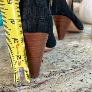 Brand new never been worn. Black suede patterned bootie’s with a 3 inch heel and decorative ankle cut out , contrasting gold zipper on the inside of shoe.