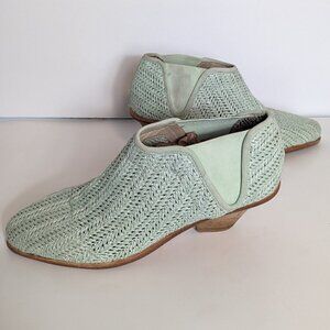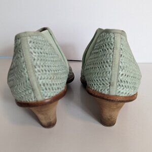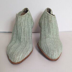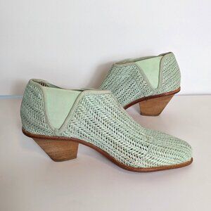 Beautiful Matt Bernson Marlow woven green raffia and leather ankle boots, booties size 8.5 M. These boots are in very good condition with some marks on the heels and the elastic stretch area of the inside left foot (see photos). The heel is 2 3/4" height. The shaft is also 2 3/4" height. US women’s size 9.