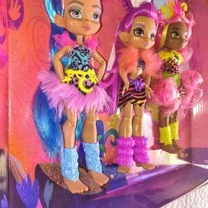 MATTEL. Cave Club, Tella, Fernessa and Roaralai. Set of three vibrant fashion dolls with colorful outfits and hairstyles. Perfect for imaginative play. Box was damaged but these are new still attached to the insert.