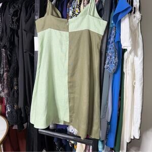 This effortlessly chic mini dress is crafted from 100% linen and made in the USA. Featuring a striking two-tone colorblock design in earthy green tones, it’s styled with slender adjustable straps, a flattering front cutout, and a partially lined interior for added comfort. The A-line silhouette and open back add a touch of playful elegance. Dry clean only.