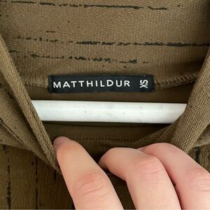 Gorgeous, artsy, stylish, HANDMADE! This MATTHILDUR top features long sleeves, a high neck, and an asymmetrical flared bottom. Full length top in center, extra long on sides. Muted brown color with black accents. Excellent preowned condition! Fitted throughout, flared at bottom, natural waistline. Size extra small. Fabric has a good amount of stretch. Stitching in back for fitting, and style stitching over flared sides. Scandinavian design, handmade in Peru.