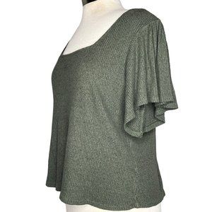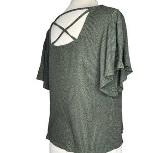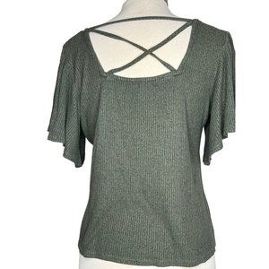 MAUNCES Women's Sweater Size Medium Pull Over Short Sleeve Green Knit Open Back Criss Cross Stretch Bell Sleeve Box Neck flaw (small whole in front bottom please see picture)