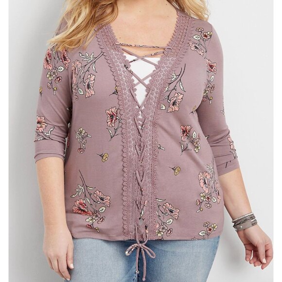 MAURICES 2 Plus Size Crochet and Lace Up Floral Top Mauve Purple 3/4 Sleeve Boho