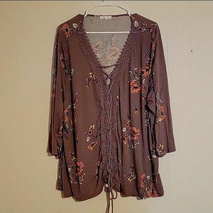 This blouse is adorable and slightly used, worn a couple times and is in like new condition. This is a BOHO style blouse with crocheted lace and is a lace-up.