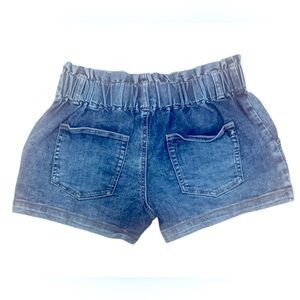These blue jean shorts feature a comfortable elastic waistband and stylish rolled hems, perfect for a casual summer look. The denim fabric has a medium-to-light blue wash with natural fading, offering a relaxed and lived-in appearance.( Waist 15” inseam 3” approximately)