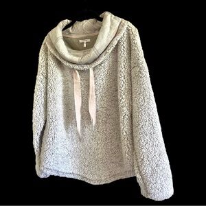 MAURICES, COWL NECK, SHERPA PULLOVER. LIGHT GREY WITH PLAID COWL & OFF SHOULDER SLEEVES. SIZE L