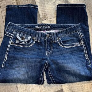 Like new condition pair of MAURICES premium capri jeans. Size 5/6 beautiful stitching throughout pocket area and seam lines factory distress/lightening throughout these look super cute with a pair of tall boots. 99% cotton 1% spandex.