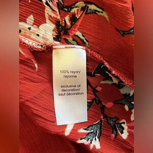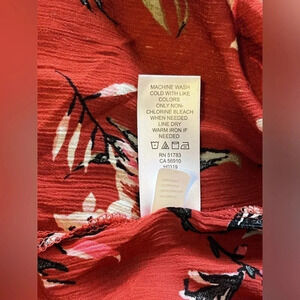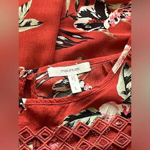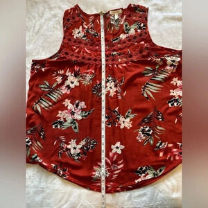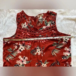 😍Rusty Burnt Red with Floral Print Throughout Crochet Trim Detail Sleeveless Flowy, Relaxed Fit Slight High Low Style Lightweight Size Large