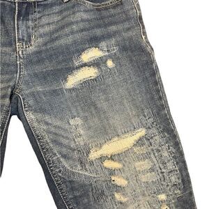 An awesome pair of Maurices jeans. The jeans are heavily distressed with decorative stitching and faded areas. Excellent condition. Size 9/10