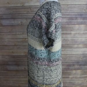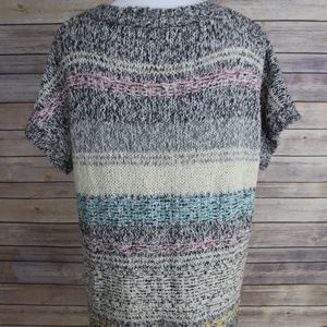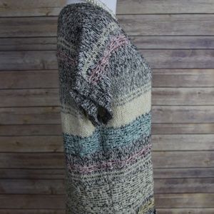 MAURICES Multi-Color Striped Short-Sleeve V-Neck Button-Down Women's Long Cardigan Sweater, Size Medium. This stylish and lengthy cardigan has a beautiful multi-color (cream, gray, black, pink, yellow, blue) striped design pattern, short sleeves, v-neckline, button down front closure, and two pockets on the lower front bodice. The material is 59% Cotton, 29% Acrylic, and 12% Nylon. The approximate measurements are as follows: Length = 32" and Bust = 40".