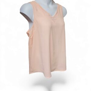This sheered V-neck tank top is lightweight Georgette Fabric, V- front, V-back, solid versatile color, sleeveless, sheer inset in both front and back, shirttail hem, relaxed fit, size large Imported, 100% Polyester, machine wash, New without tags no damage.