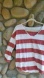 Casual long sleeve top with bold red and white stripes. Features a V-neck with button detail. Perfect for everyday wear.