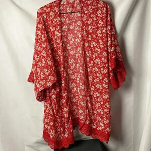 MAURICES WO SIZE XXL RED FLORAL OPEN FRONT SUSTER OVER SHIRT RED CROCHET TRIM
