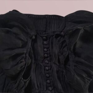 * MADE OF SHEER LIGHTWEIGHT POLYESTER CHIFFON FABRIC WITH A LOLITA-STYLE, PARCIE CRINKLED MATERIAL, SHORT PUFFED SLEEVES, AND BUTTON DOWN FRONT WITH A PEPLUM WAIST THAT OPENS UP ON ONE SIDE WITH LITTLE SNAPS AND HOOK