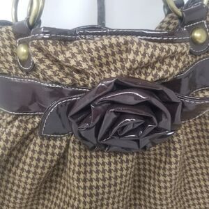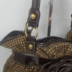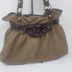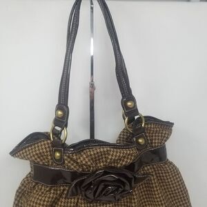 Shoulder bag. Perfect Autumn, Winter bag. Checked lightweight woolen like fabric. Brown tan. Beautiful rise like accent in front. Clean inside. Maurices. Approximate measurements are 16" x 11.5". Straps are approximately 22" and are not adjustable. Very pretty.