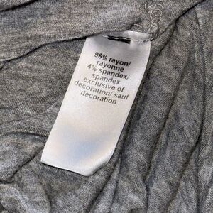 Excellent use condition women's short sleeve shirt made by MAURICES. Size 3. 96% rayon 4% spandex, gray in color with dark gray/black athletic sleeves. Pit to Pit measurement is 27 inches, and length from neckline to bottom hemline is 26.5 inches.