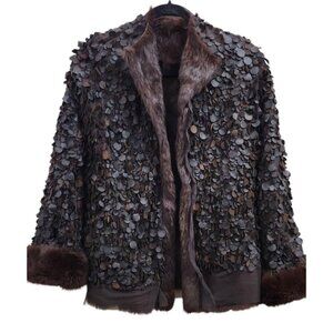 Elegant Reversible Rabbit Fur Short Coat** – a stylish blend of comfort and sophistication. One side features soft, silky rabbit fur, offering warmth and coziness. The inner lining showcases delicate leather circles on mesh, intricately embroidered to create a unique decorative accent, giving the piece an exclusive look.