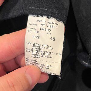 GRIFONI DARK NAVY BRUSHED COTTON DOUBLE BREASTED PEACOAT IN A MARKED SIZE 48R- U.S M. THE JACKET FEATURES A DARK NAVY BRUSHED COTTON- FEELS LIKE VELVET, BUTTON FRONT, SHARP LAPELS, DOUBLE PANE SEAT, FULLY LINED. GREAT CONDITION