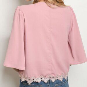 This MAUVE TOP features 3/4 flutter sleeve V-neck crochet trim.