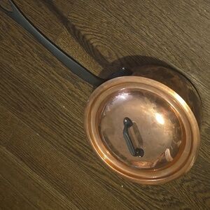 Premium Mauviel saucepan in copper. Features a polished lid and sleek handle. Ideal for culinary enthusiasts.