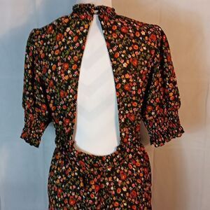 Elegant New with tags backless floral midi dress with a black base, perfect for any occasion. Size Large with a pit to pit measuring 20-1/2" an elastic waist measuring 16" laying flat and a length of 46".