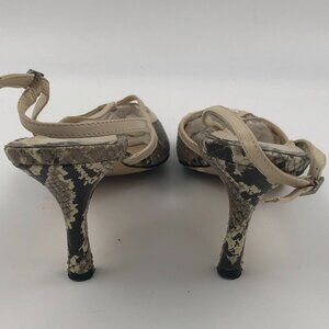 Lovely snakeskin patterned leather with cream leather accents in this sexy slingback will dress up any outfit you choose. Great pre-owned condition.