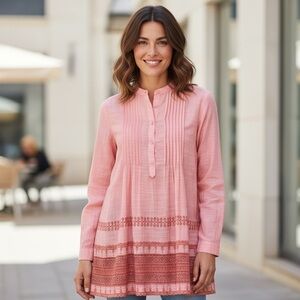 Max Edition tunic top is a bohemian aesthetic featuring pleating on the bodice and embroidered patterned detailing along the hem. Long Sleeve, buttons on front.