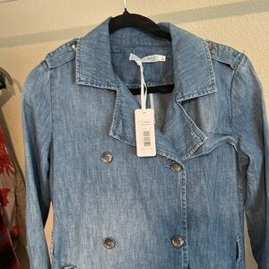 Max jeans by Max Studios New # with tags military double breasted trenchcoat light wash 70% cotton 30% linen epaulets on shoulders, flap on back, belt not included long sleeve, not lined two front slant flap pockets, rain, shield, and gun flap real stylish, trenchcoat measurements in pics.Check all pics. Comment with any questions.