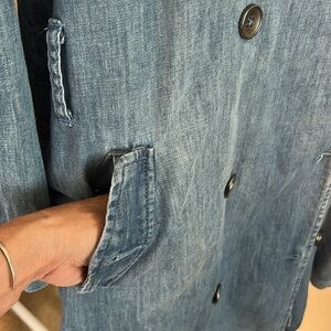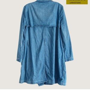 Max jeans by Max Studios New # with tags military double breasted trenchcoat light wash 70% cotton 30% linen epaulets on shoulders, flap on back, belt not included long sleeve, not lined two front slant flap pockets, rain, shield, and gun flap real stylish, trenchcoat measurements in pics.Check all pics. Comment with any questions.