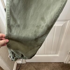 Preowned, the seam on the inside front right between legs is loose and separating some, no hole, and there are some water/grease spots on the front of pants, see photos for condition