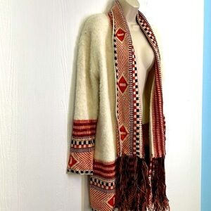 MAX SPORT - Ivory & Orange Long Boho Peruvian Fringe Beautiful Open Cardigan M